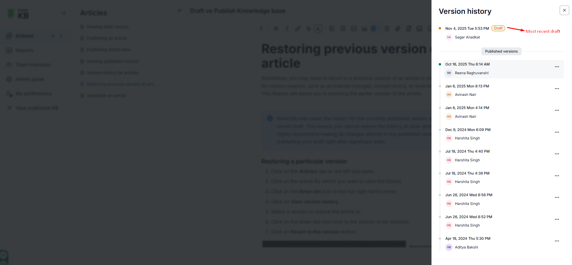 NeetoKB only saves the history for published version and the most recent draft. This means you cannot restore the history of older drafts. For safety, we highly recommend making all changes directly in the published version, or at least publishing your draft right after significant edits.